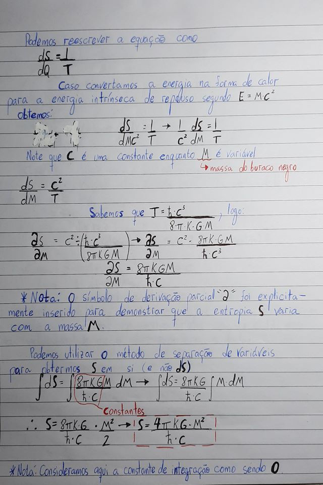 Having understood the general process of thermal radiation, we can proceed to Hawking radiation. The following description, found in Jorge Pinochet's article "The Hawking temperature, the uncertainty principle and quantum black holes", provides a more intuitive and non-rigorous look at black hole radiation, even though it is a physical description distinct from that provided by Hawking. To start, let's consider the aforementioned quantum black holes. We know that the uncertainty principle is given by∆x∆p≥ℏ/2 (as shown in previous articles). We can rewrite it according to photo 8, in order to obtain ∆v≥ℏ/(2m∆x). An electron inside a quantum black hole has a small uncertainty in its position (also shown in photo 8), given the tiny size of the black hole. We assume that the uncertainty in the position is of the order of 10^-15 meters. Considering that the electron mass is approximately 10^-30 kg, we obtain an uncertainty at the speed of approximately 3*10^17 (an extremely high uncertainty, as expected by the Heisenberg uncertainty principle). With ∆v>c we see that the uncertainty in the electron velocity is greater than the speed of light itself, implying a sufficient escape velocity for the electron to "escape" from the black hole. When it comes out of the black hole, the electron is taking away its mass along, and therefore the mass of the black hole is decreased. The continuity of this process would characterize the emission of Hawking radiation. What we have just concluded apparently infers in the violation of relativistic mechanics, which says that no particle can travel at a speed equal to or greater than that of light. However, because we are within the prospect of uncertainty, we cannot measure/observe a particle effectively traveling faster than the speed of light (not violating relativistic mechanics). We can also analyze the situation from other perspective, in terms of the quantum tunneling phenomenon (discussed in the schrödinger equation article). In quantum tunneling, a particle, like the electron, can overcome/penetrate a potential barrier even without having enough energy to do so, which, in our case, translates that there is a possibility that the electron escapes from the black hole. The simple derivation of the Hawking temperature formula and the entropy of the black hole, according to the approach presented, are found in photos 9, 10 and 11). Analyzing T=(ℏc^3)/(8πkGM) we can come to some conclusions: the larger (more massive) a black hole is, the lower its temperature (which implies in the emission of less energetic black body spectrum radiation). Calculations for the temperature of quantum and supermassive black holes can be found in photo 12. As can be seen in the calculations made, the radiation of large-mass black holes is negligible, because the rate of radiation emission is extremely small, while it is easy for the black hole to acquire extra mass by mechanisms such as accretion, which would debunk the "progress" of mass reduction by Hawking radiation. We can also note that as the black hole emits radiation, its mass is progressively reduced, so that the more it loses mass the more radiation it emits (Hawking radiation gets more substantial with time). Black holes take an extremely long time to evaporate; a black hole with the mass of the Sun would take up to 10^67 years while one with the mass of Sagittarius A* (supermassive black hole at the center of the Milky Way) would take around 10^87 years. Still, a proton-sized black hole would take about 10^13 years to evaporate completely (keep in mind that the age of the universe is in the order of 10^10 years). Despite all the conclusions provided, the equation for the temperature of a black hole has a limit, this being the Planck mass, given by m_Planck=√(ℏc/G)≅10^(-8) kg. But what happens when the effects of Hawking radiation pushes the mass of the black hole beyond that limit? The answer is, we don't know for sure. However, Hawking strongly believed that the black hole would simply disappear. It is at this point that the "paradox of information" arises, which will be discussed later.