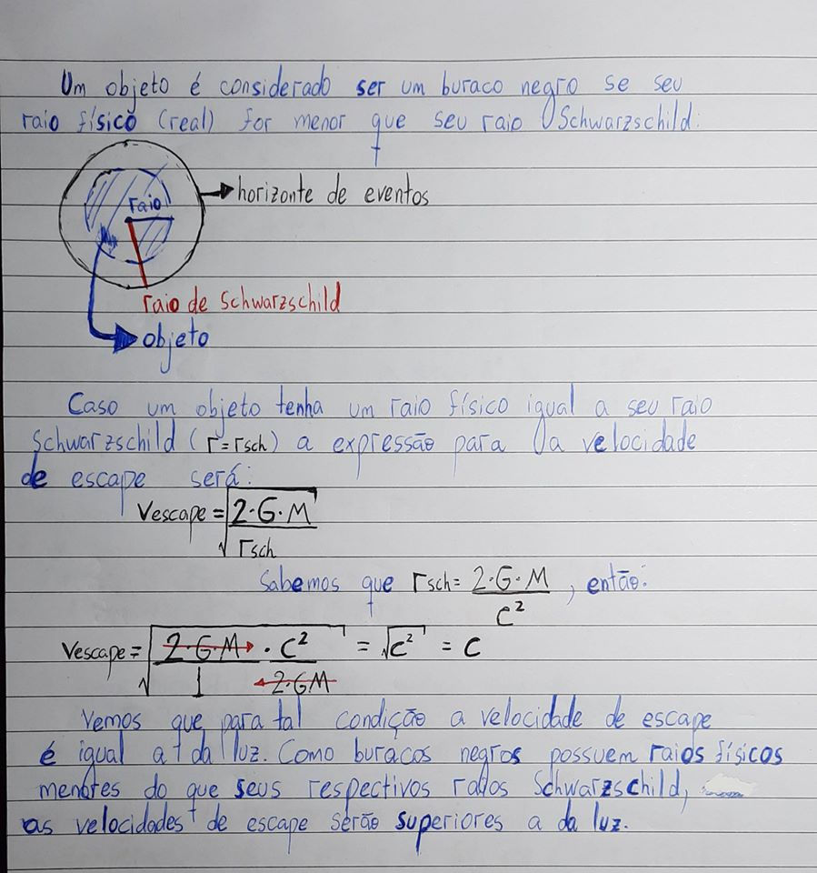 As described in previous chapters, black holes are composed of a singularity (a point of infinite density in which the laws of science currently fail) and have event horizons, these being located at a certain distance from the singularity, given by the schwarzschild radius (photo 2). It is important to note that the event horizon is not a physical surface, but rather the delimitation of a boundary from which nothing, not even light, can escape from being consumed by the black hole (this is due to the fact that, from the event horizon, the escape velocity (defined in photos 3 and 4) required becomes higher than that of light , as shown in photo 5).