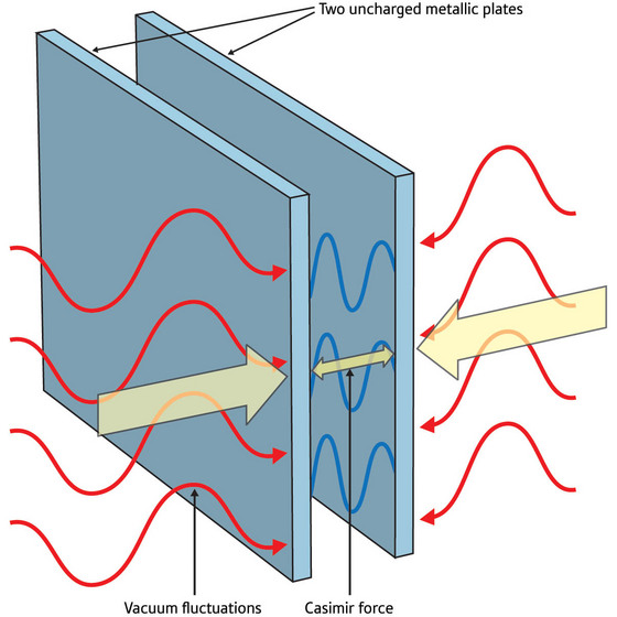With so much theoretical content "at odds" with the everyday world, it becomes easy to question the veracity of phenomena involving the quantum realm. However, science is formed by rigid and empirical bases. In 1948 Casimir conducted an experiment that proved once and for all the existence of quantum vacuum fluctuations and the existence of virtual particles. This experiment consists of two metal plates, separated by only a few nanometers, inserted in a vacuum. In the small space between the plates, there is a limitation on the wavelengths that virtual photons can assume, whereas in the outer space, where there are no restrictions, the photons can assume a larger range of wavelength. Thus, it is expected that there is a higher incidence of photons on the outer walls than on the inner walls, which generates a force on the plates, promoting an approximation / displacement between them. The experiment carried out agreed with the theoretical predictions, in order to effectively confirm the veracity of the virtual particles.