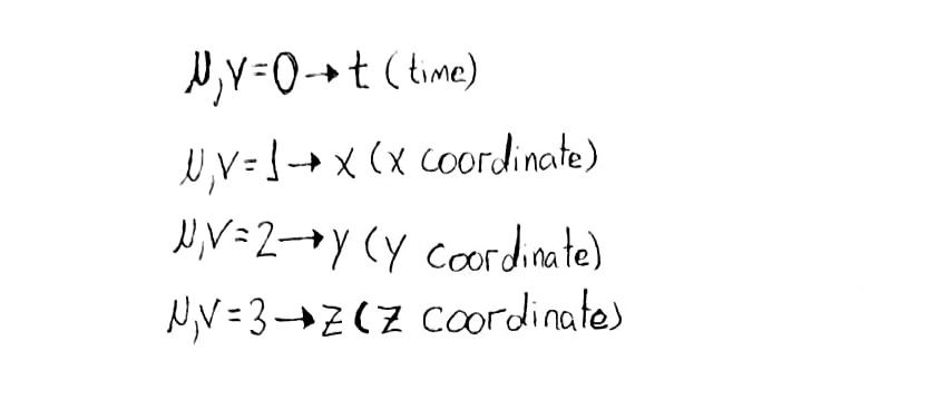 It may be a surprise, but the photo above illustrates sixteen equations, not one. This is because the entities containing the subscripts are not scalars, nor vectors, but tensors. The subscripts µ and ν indicate the spatial and temporal coordinates, as shown below.